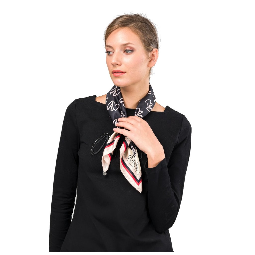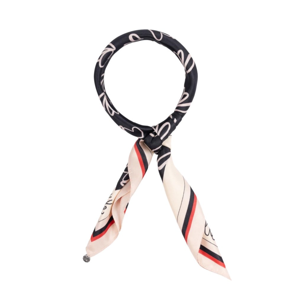 Čtvercový šátek v elegantní kombinaci béžové, černé a červené barvy. Jemný materiál a propracovaný design