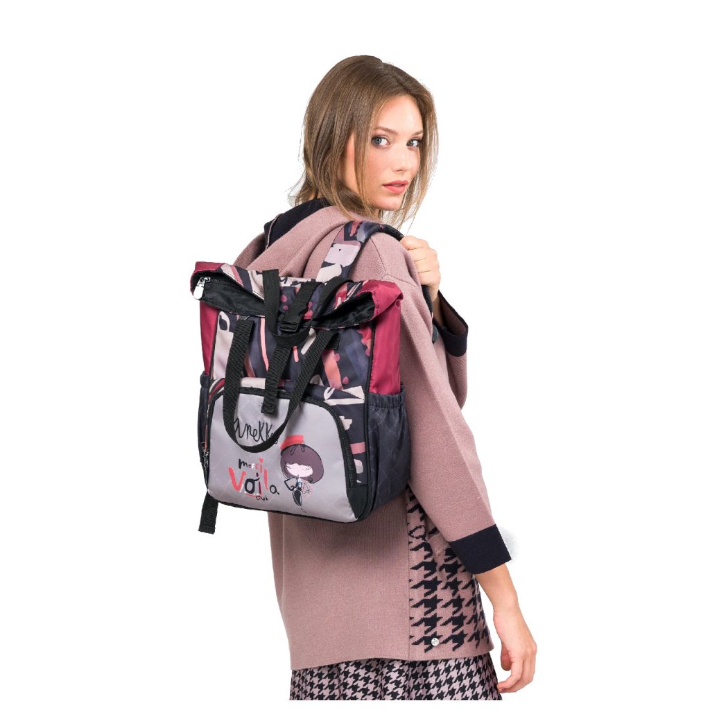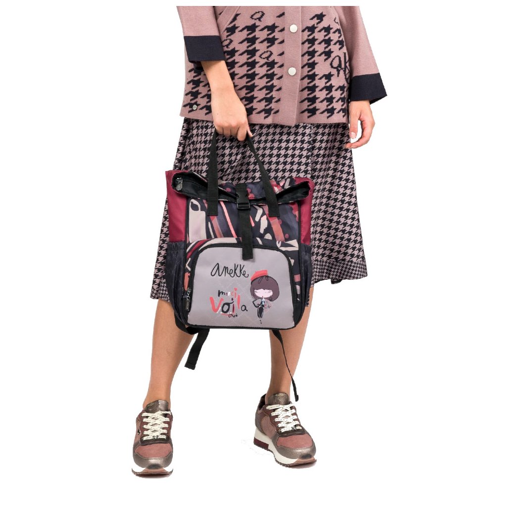 Dámský batoh Anekke má dvě ucha do ruky (výška 14cm) a dva nastavitelné popruhy (délka 70cm) přes ramena. Na přední straně batohu dvě kapsy na zip a na zadní straně jedna kapsa na zip. Batoh se uzavírá na zip.