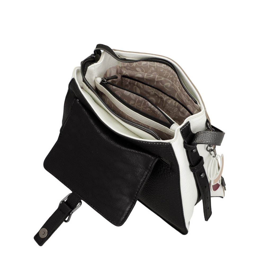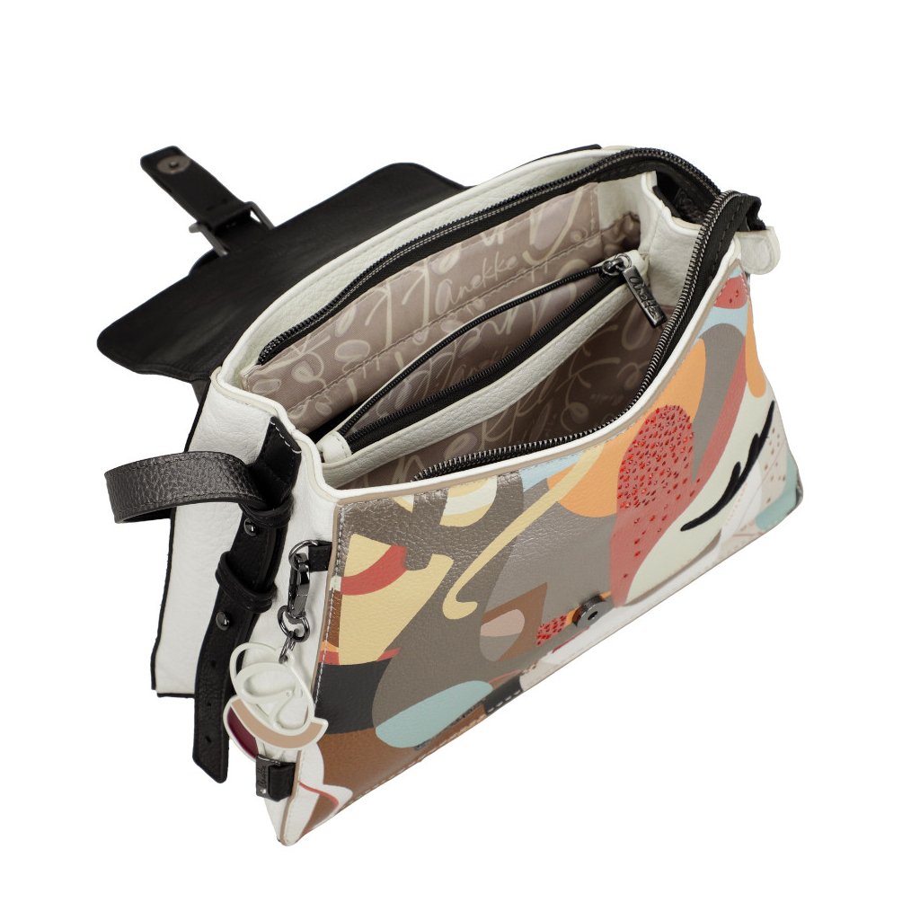Dámská crossbody kabelka Anekke s nastavitelnám popruhem. Na zadní straně kapsa na zip. uvnitř kabelky kapsa na zip a kapsa otevřená. Kabelka se uzavírá na klopu s magnetickým zapínáním.