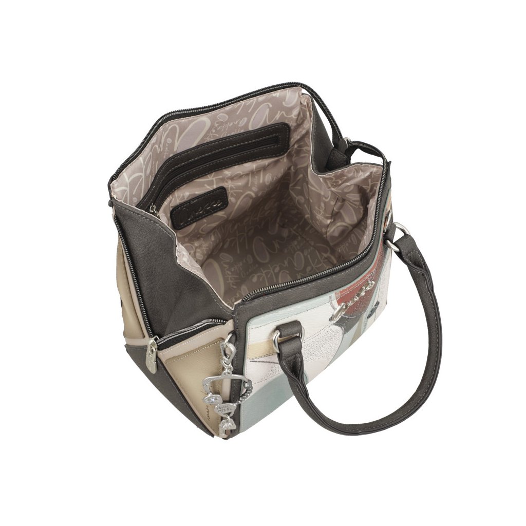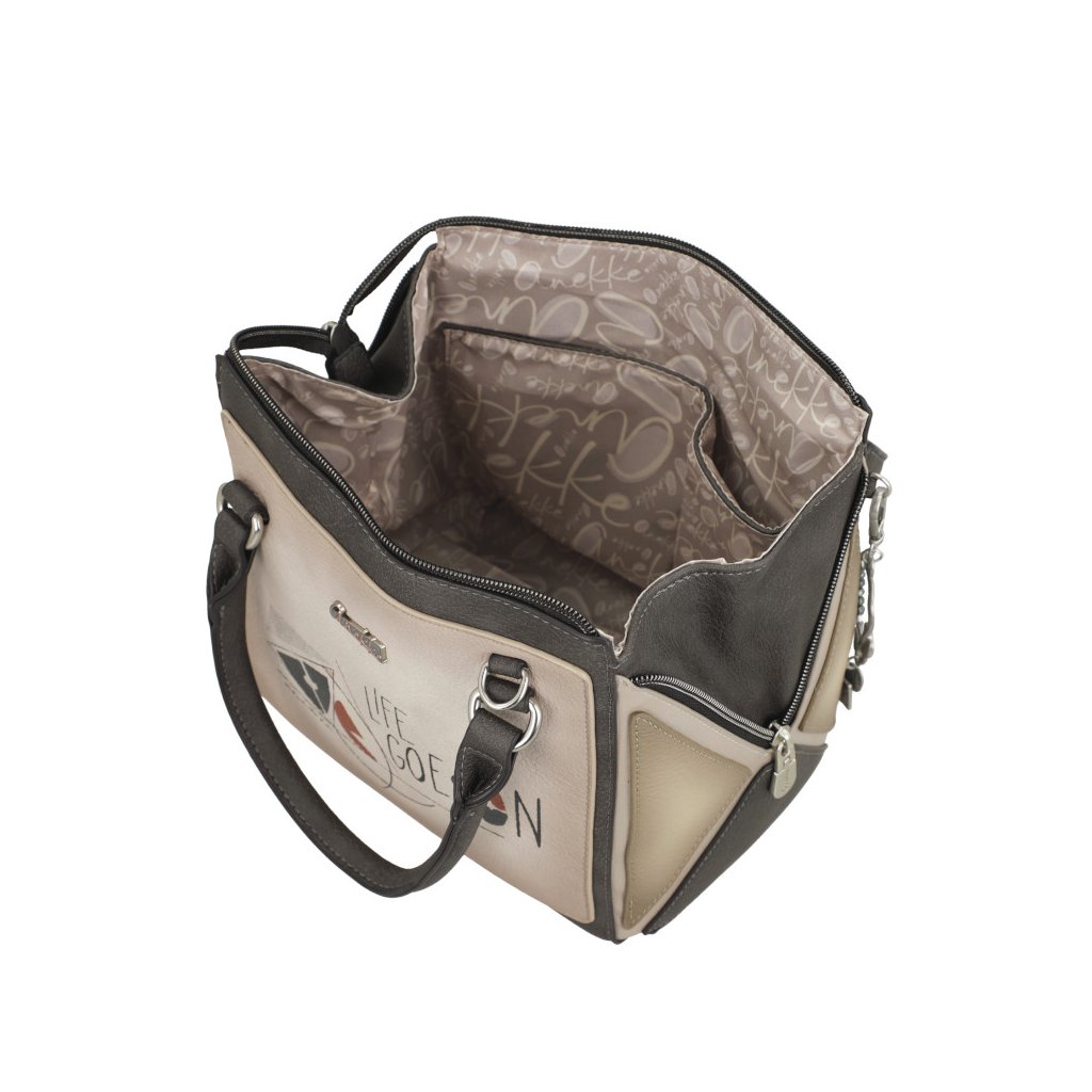Dámská kabelka Anekke se dvěma uchy do ruky a nastavitelným odnímatelným popruhem přes rameno. Uvnitř jedna kapsa na zip a dvě otevřené. Kabelka se uzavírá na zip.