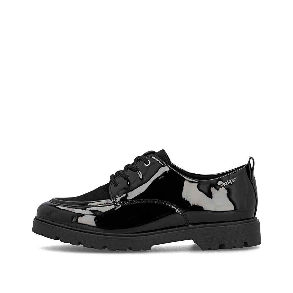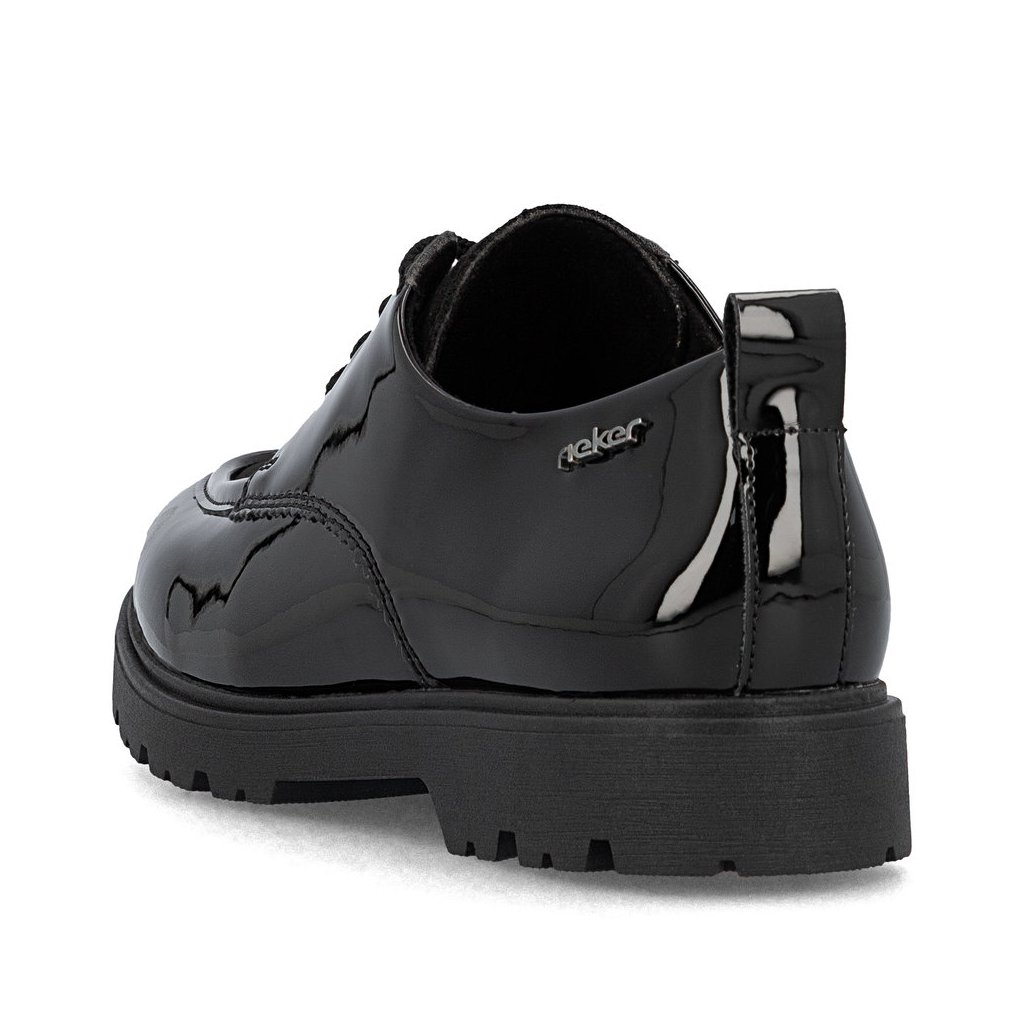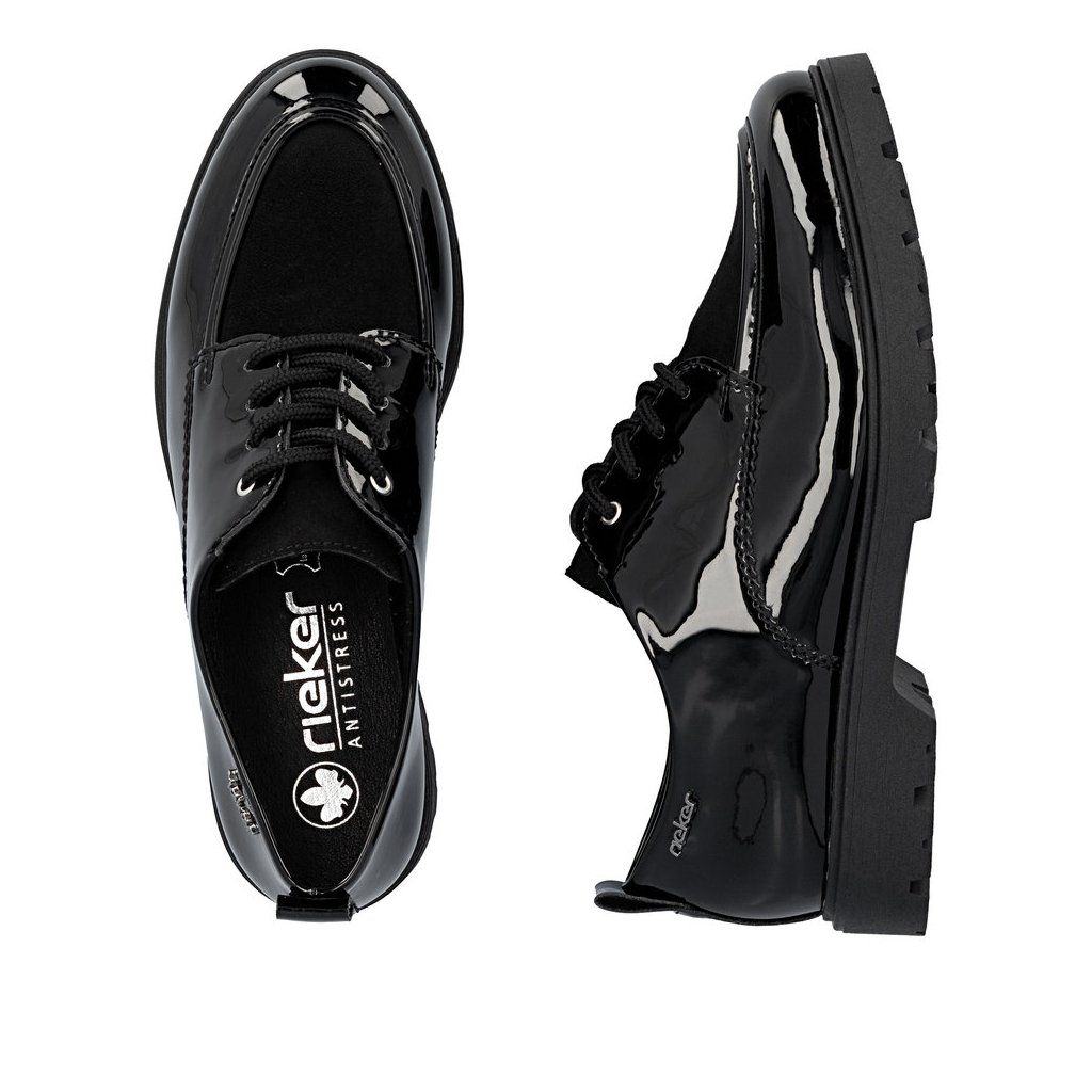 Dámské polobotky Rieker v černé lakované barvě s mohutnější podešví pro lepší stabilitu. Uvnitř obuvi pohodlná kožená stélka.