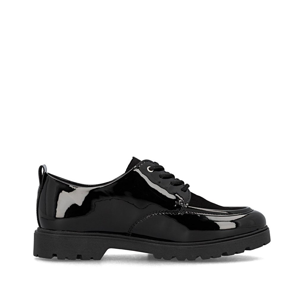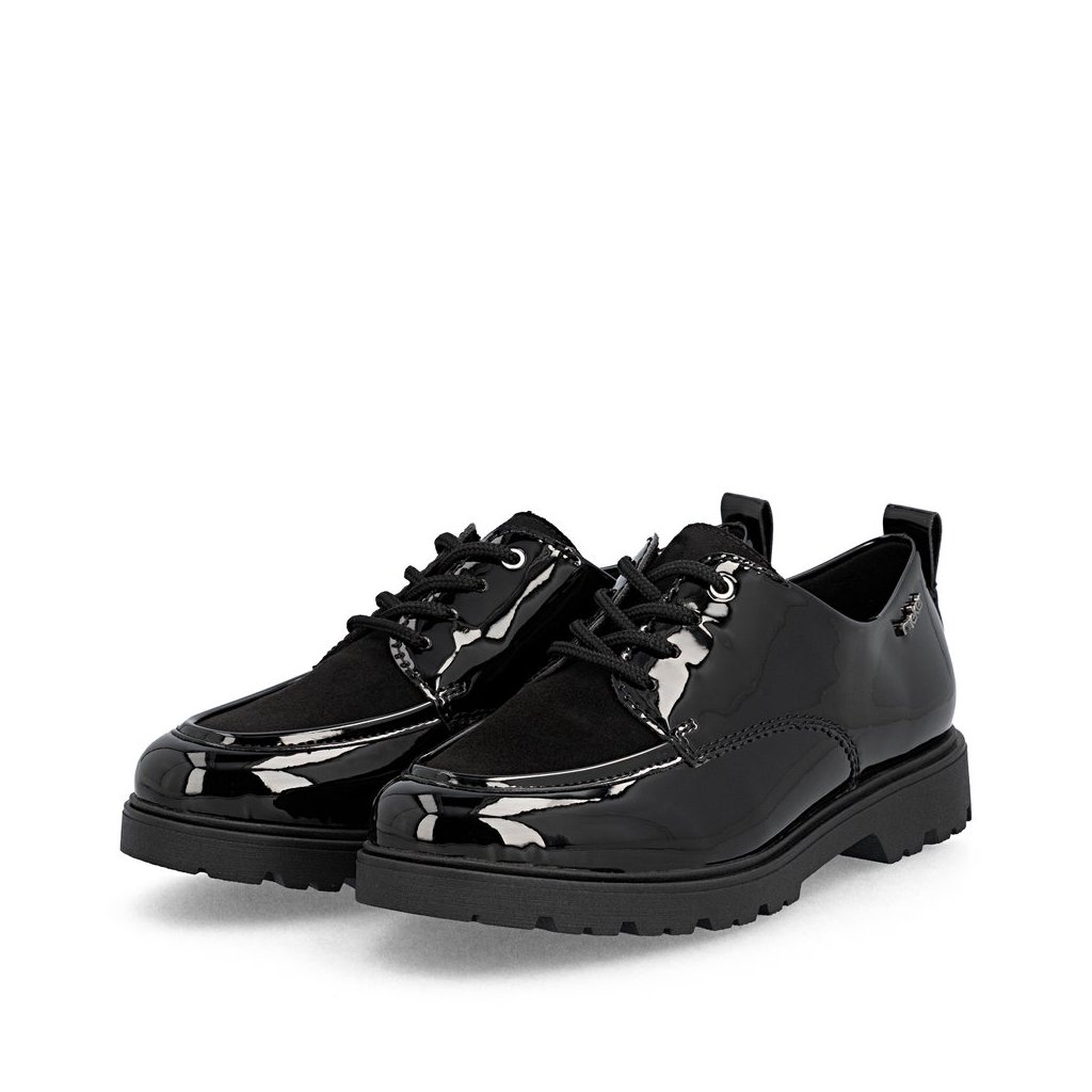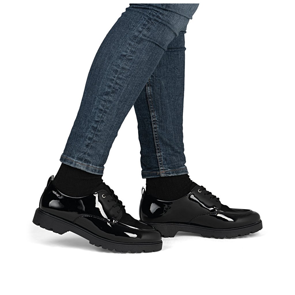 Dámské polobotky Rieker v černé lakované barvě s mohutnější podešví pro lepší stabilitu. Uvnitř obuvi pohodlná kožená stélka.