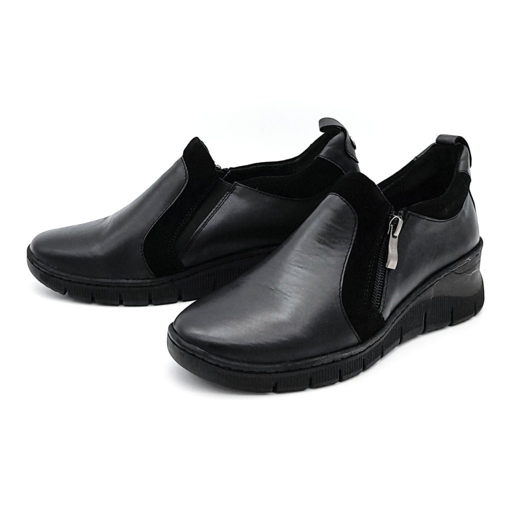 Dámské kožené mokasíny se semišovými prvky, kožená stélka. Snadné nazouvání zajišťuje elastická vsadka na vnitřní straně obuvi a zip na vnější straně obuvi.