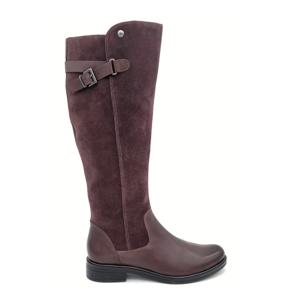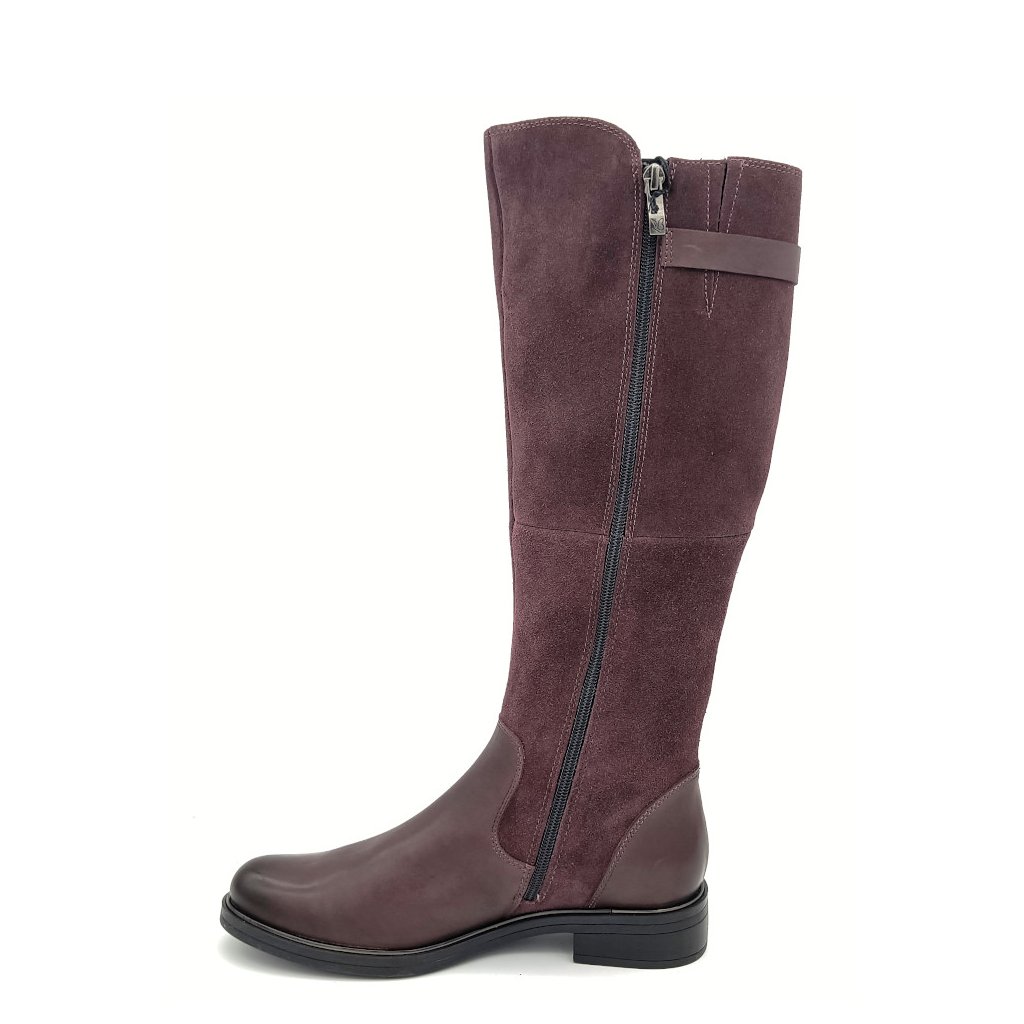 Dámské kozačky, vyrobené z hladké kůže v kombinaci broušené kůže.. Vnitřek obuvi tvoří lehce zateplená podšívka.
