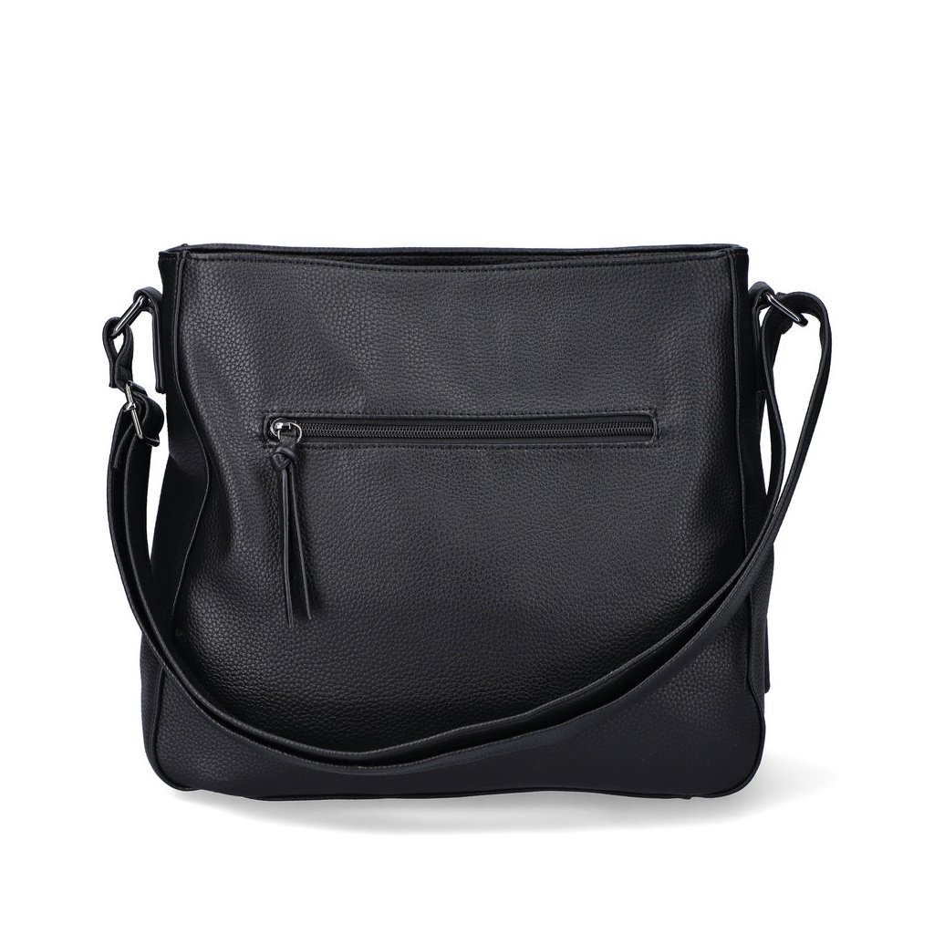 Dámská crossbody syntetická kabelka má na přední straně kapsu uzavíratelnou na magnet a kapsu zipovou. Zadní strana má kapsu uzavíratelnou na zip. Kabelka je rozdělena na dvě separace a uzavírá se na dva zipy, v jedné části je kapsa na mobil, ve druhé kapsa na zip. Dlouhé držadlo je posuvné. Rozměry: šířka ve dně i u zipů je 30 cm, výška: 27 cm, šířka dna: 12,5 cm, šířka bočnice v horní části u zipů: 5cm.