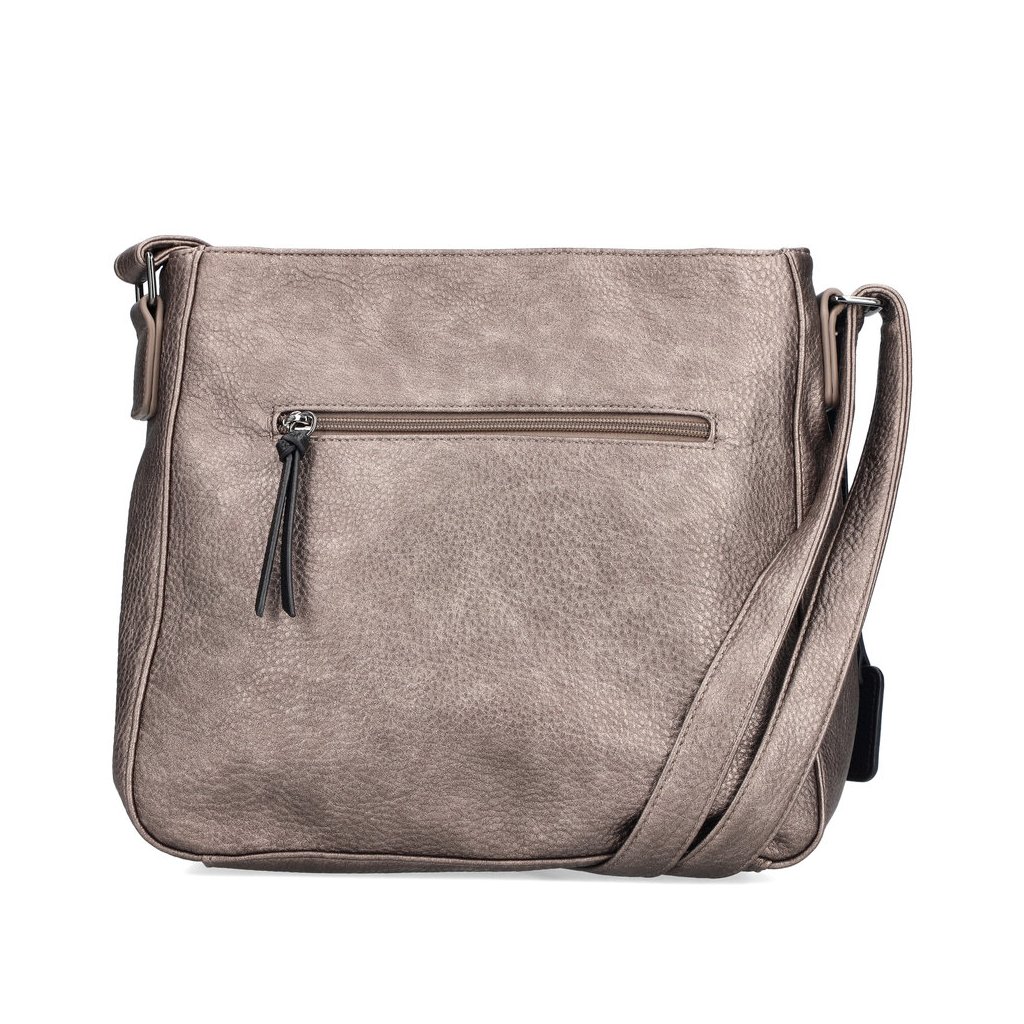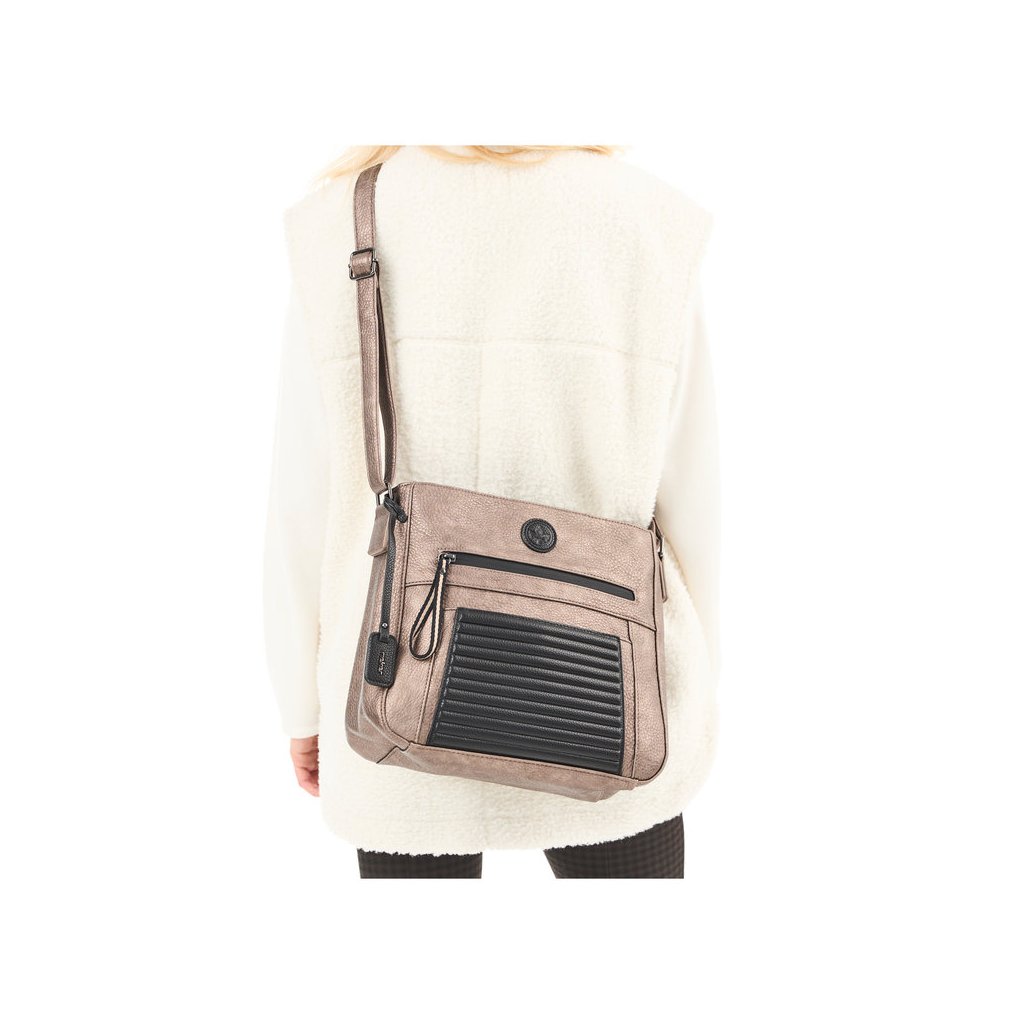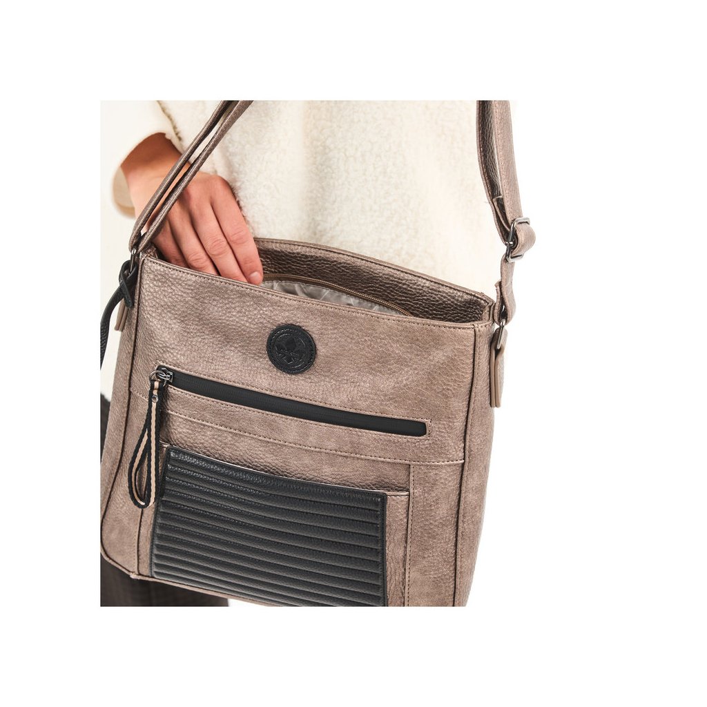 Dámská kabelka s nastavitelným popruhem ( délka125 cm) přes rameno, nebo šikmo přes rameno jako crossbody. Na zadní a přední straně kapsa na zip. Kabelka je rozdělena na dvě komory s uzavíráním na zip. Uvnitř kabelky jedna kapsa na zip a dvě kapsy otevřené.