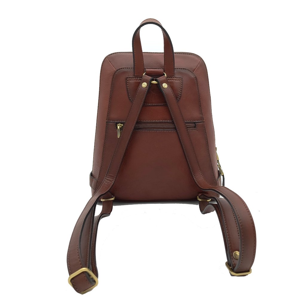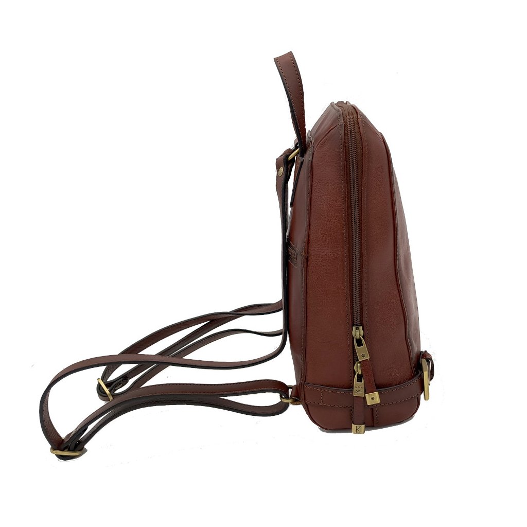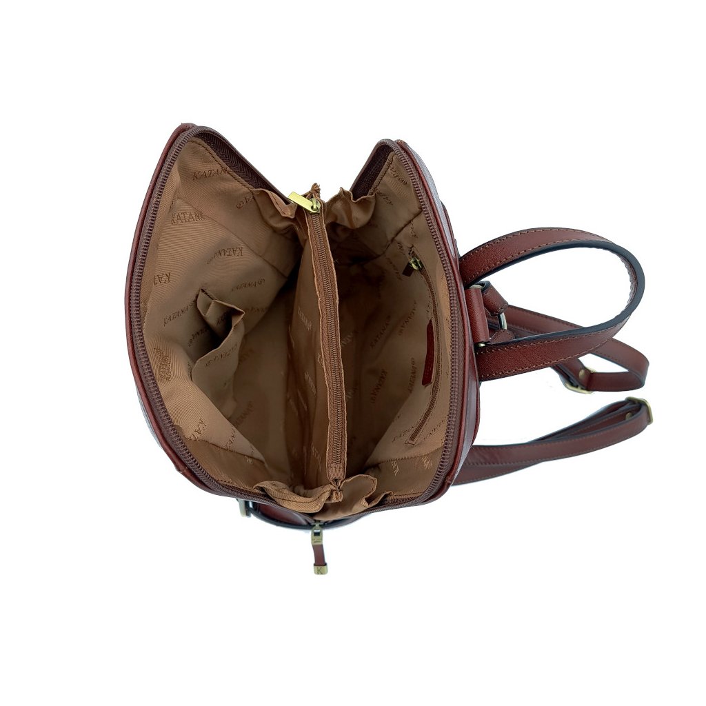 Dámský kožený batoh Katana s jedním uchem (výška 8 cm) do ruky a s nastavitelnými popruhy přes rameno. Na zadní straně kapsa na zip. Uzavírání batohu je na zip. Uvnitř batohu přepážka se zipem, jedna kapsa na zip a jedna kapsa otevřená.