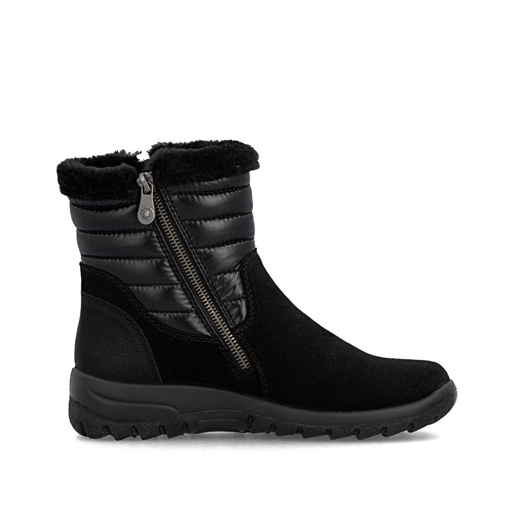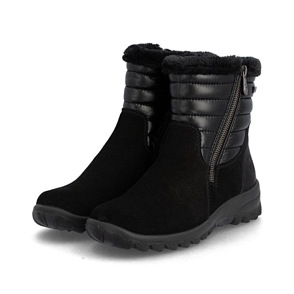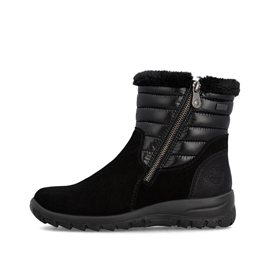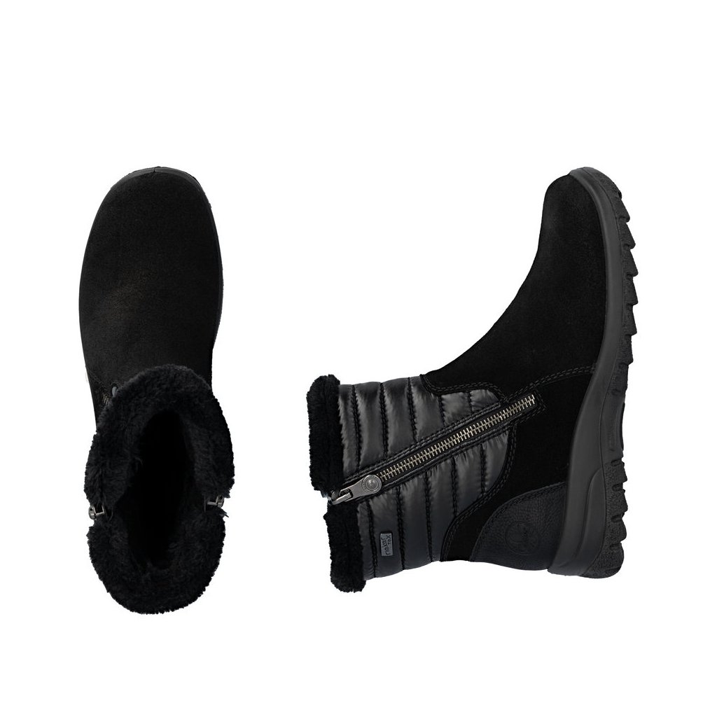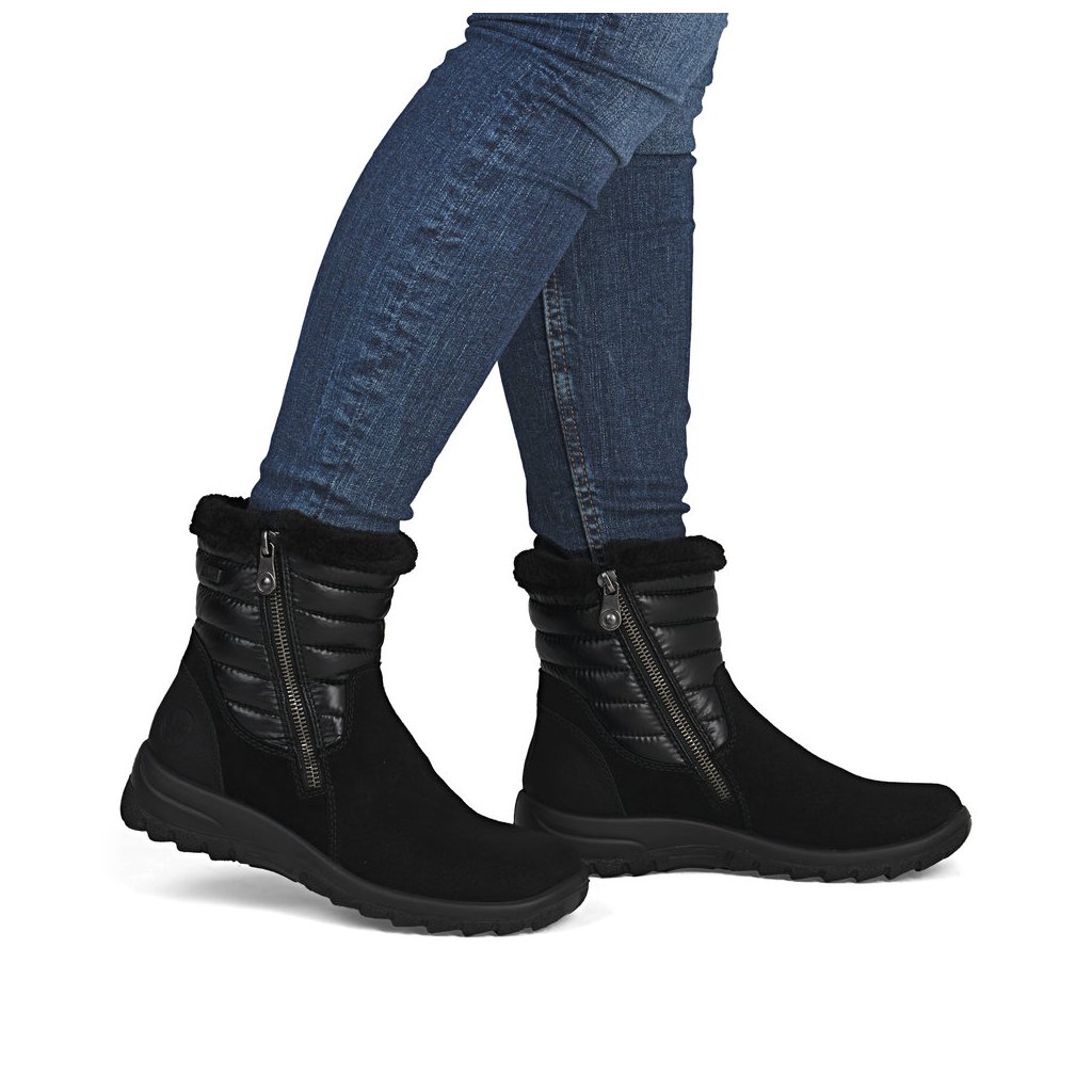 Černé semišové kotníkové boty Rieker s polstrovaným okrajem v horní části, dodává botě moderní nádech. Měkká podšívka udrží nohy v teple po celý den a technologie RiekerTEX je udrží v suchu.
