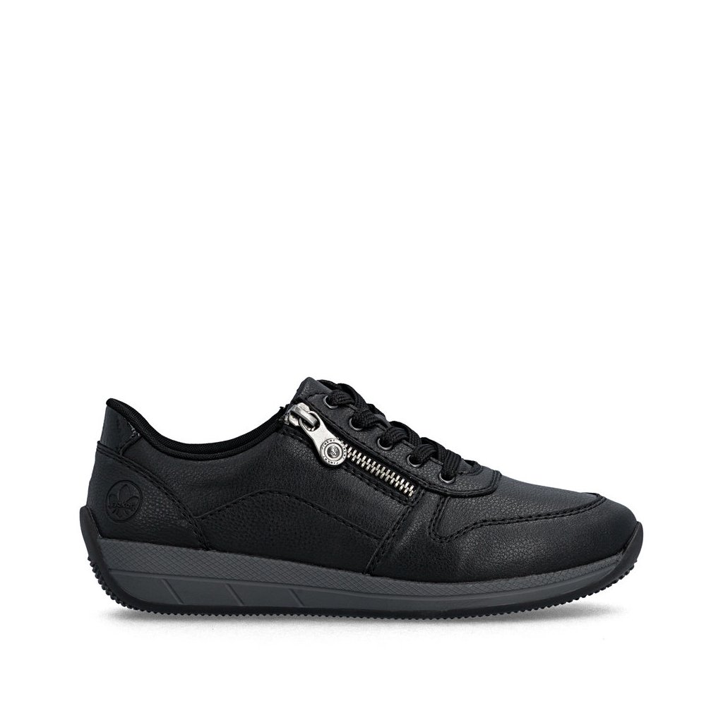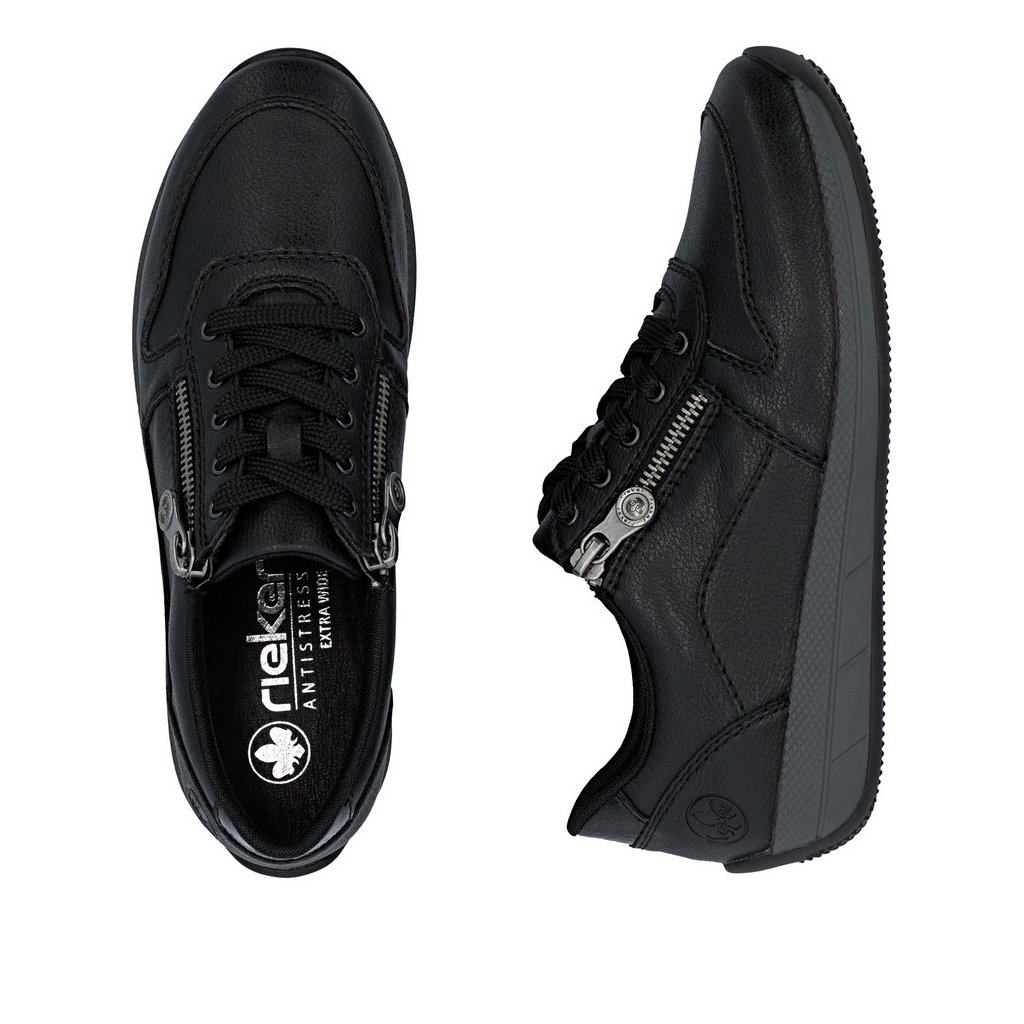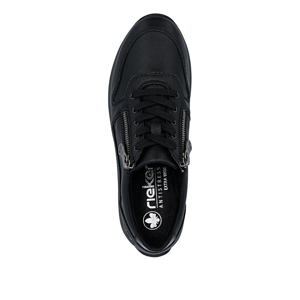 Dámské polobotky Rieker jsou pohodlné dámské polobotky v černé barvě s kombinací šněrování a zipu pro snadné obouvání. Díky technologii Antistress, měkké vyjímatelné stélce a flexibilní podrážce jsou ideální na každodenní nošení i delší chůzi.