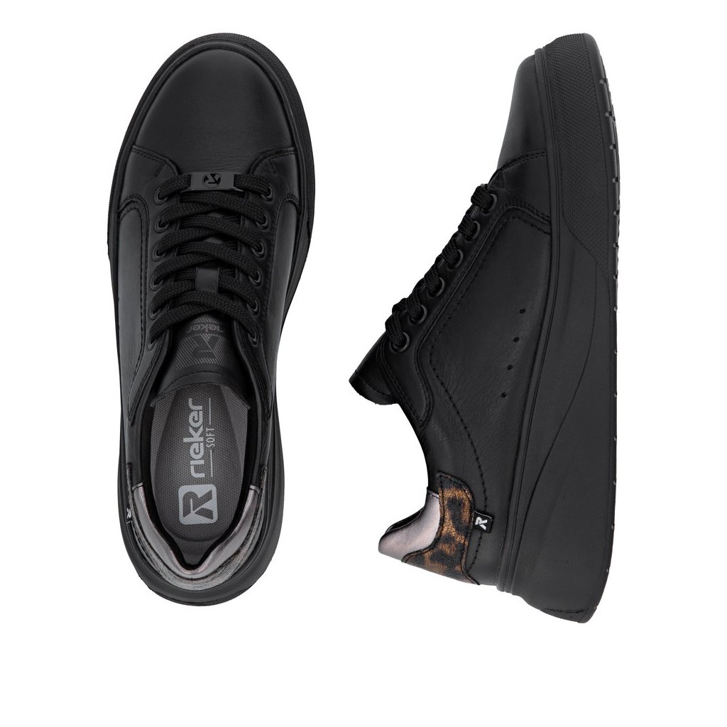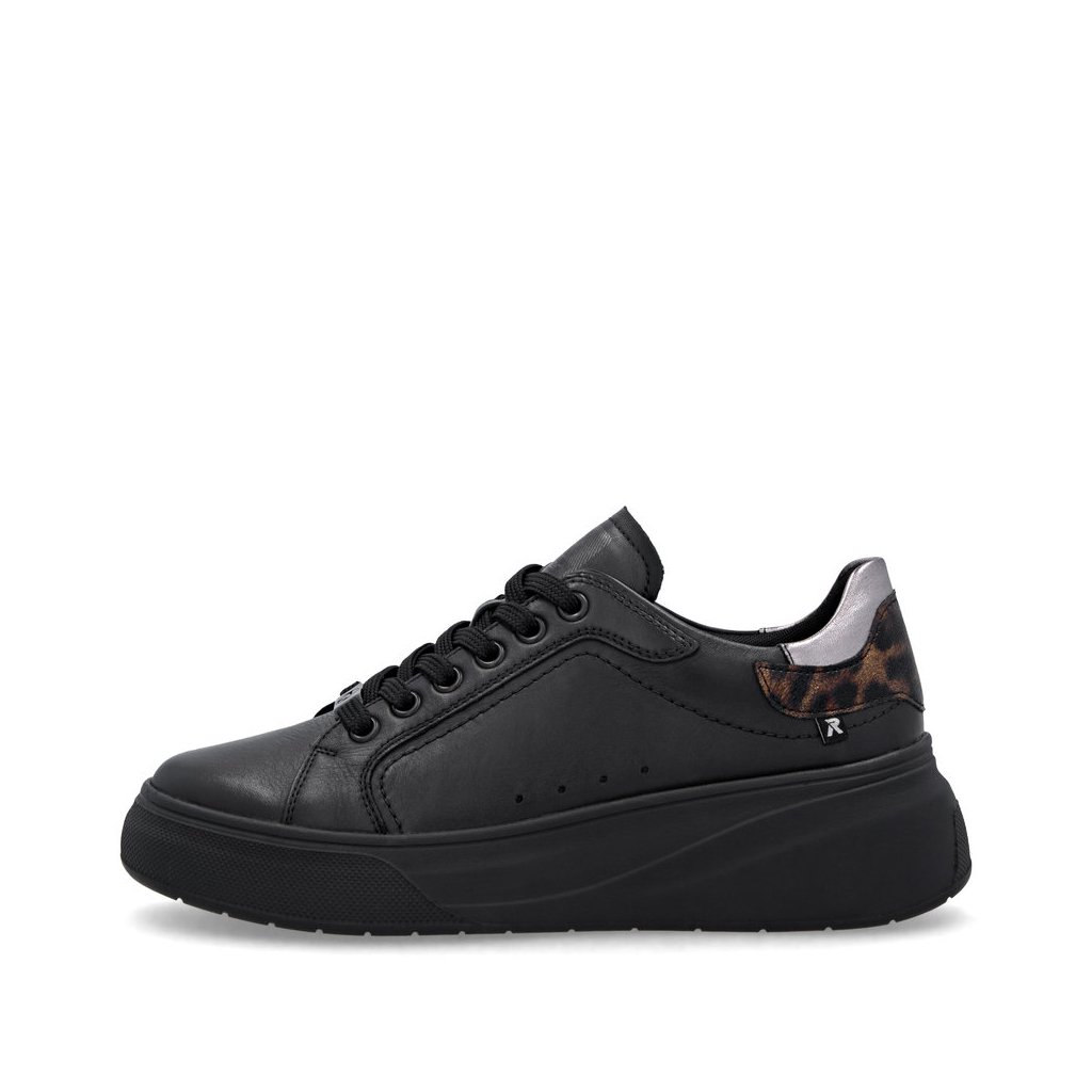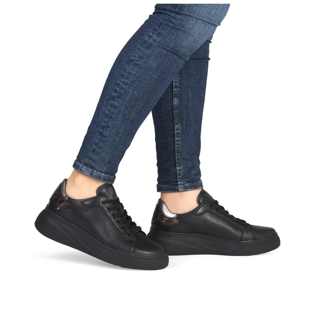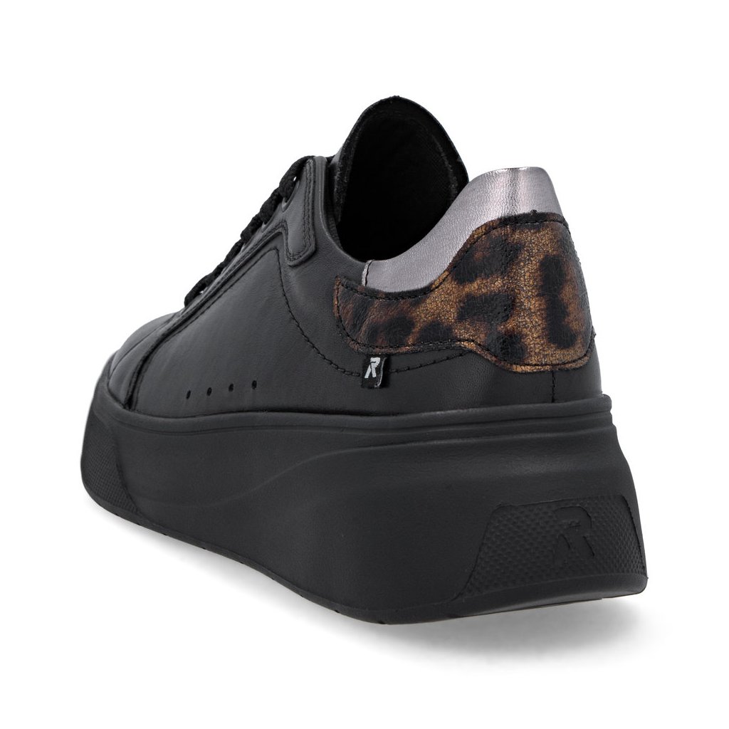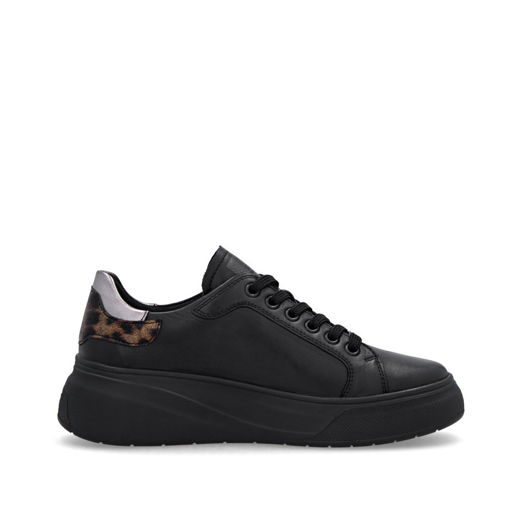 Dámské tenisky Rieker se zvířecím vzorem na patě. Vyšši podešev tlumící nárazy při chůzi. Uvnitř obuvi měkká stélka